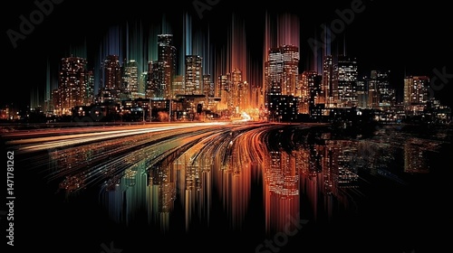 © Alicia, Fototapeta premium City skyline at night with blurred lights creating motion effect.