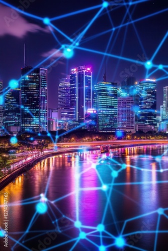 © felix_brönnimann, Obraz premium City skyline at night with digital network connections, showcasing technology and urban innovation in a vibrant metropolis.