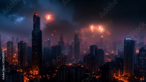 © HATO PROJECT, Fototapeta premium City skyline at night with fireworks display in a misty atmosphere.