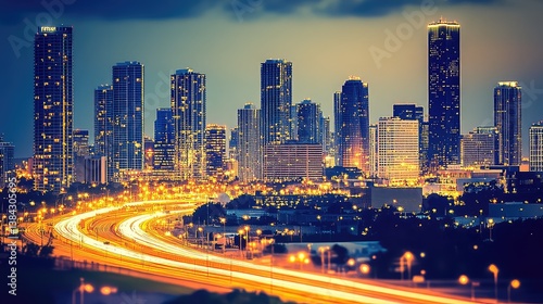 © diki, Fototapeta premium City skyline at night with illuminated buildings