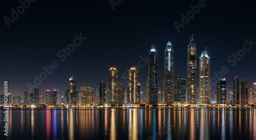 © Pixelart, Fototapeta premium City skyline at night with illuminated buildings reflecting in water.