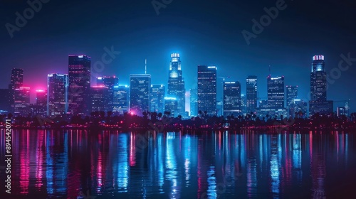 © Anzhela, Fototapeta premium City skyline at night with neon lights