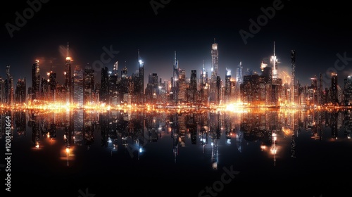 Fototapeta premium City skyline at night with reflections in water creating a vibrant urban...