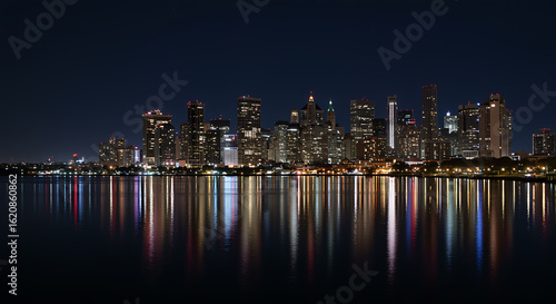 © islam bepari, Fototapeta premium City skyline at night with water reflections cityscape