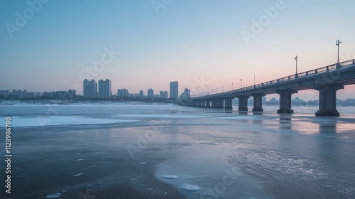© mas, Obraz premium City skyline at sunrise over a frozen river with bridge.