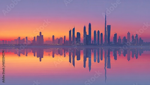© Pisang, Naklejka premium City skyline at sunrise, reflected in water