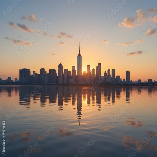 © Khan, Fototapeta premium City skyline at sunrise, reflected in water