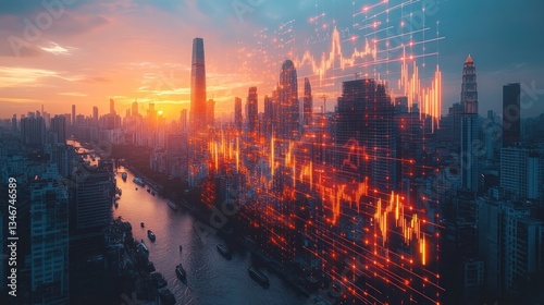Fototapeta premium City skyline at sunrise with financial data overlay