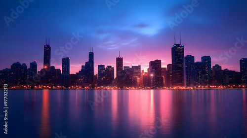 © Siasart Stock, Fototapeta premium City skyline at sunrise, with pink and purple clouds reflecting on the water.