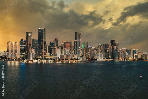 Naklejka premium city skyline at sunset beautiful miami buildings sea sky skyscrapers luxury...
