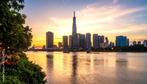© Sarofah, Fototapeta premium City skyline at sunset over a river (3)