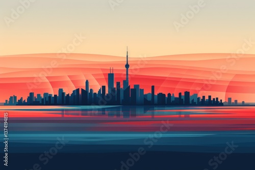 © djatu, Obraz premium City skyline at sunset reflected in calm water, stylized graphic illustration.