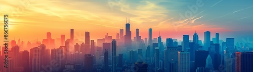 © tinnakorn, Fototapeta premium City skyline at sunset with a colorful sky.