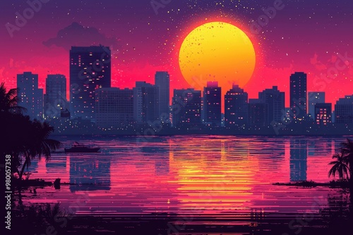 © Outkast, Obraz premium City Skyline at Sunset with a Large Yellow Sun and Palm Trees