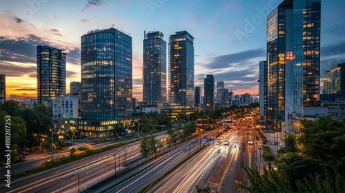 © Zoro, Fototapeta premium City skyline at sunset with busy highway and modern skyscrapers.