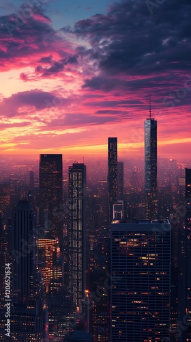 © projek, Obraz premium City skyline at sunset with colorful clouds and towering buildings.