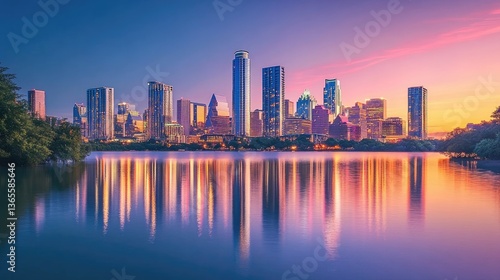© Lilly, Naklejka premium City skyline at sunset with downtown buildings glowing against the horizon