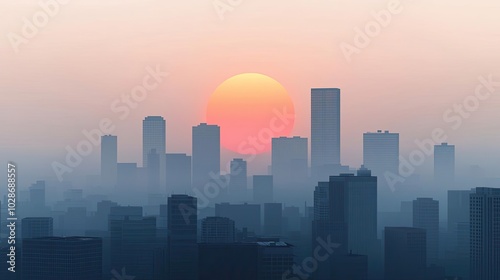 © Thamonchanok, Fototapeta premium City skyline at sunset with hazy atmosphere and skyscrapers silhouetted.