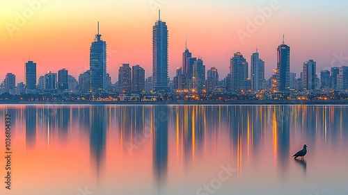 © arsyi_06, Obraz premium City skyline at sunset with reflective water.