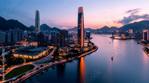 © Zatra, Fototapeta premium City Skyline at Sunset with River Reflections