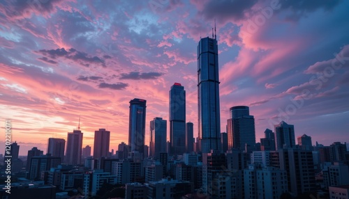 © Artha, Fototapeta premium city skyline at sunset with skyscrapers and urban architecture