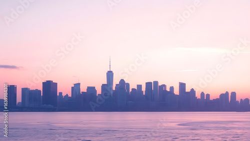 Fototapeta premium City Skyline at Sunset with Soft Pastel Pink and Purple Hues – Cinematic...