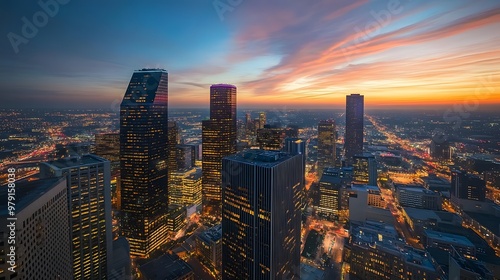 Fototapeta premium City skyline at sunset with vibrant colors.