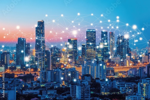 Fototapeta premium City skyline at twilight, connected by digital network