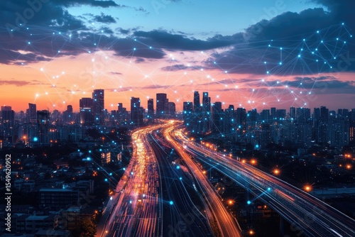Obraz premium City skyline at twilight, network overlay