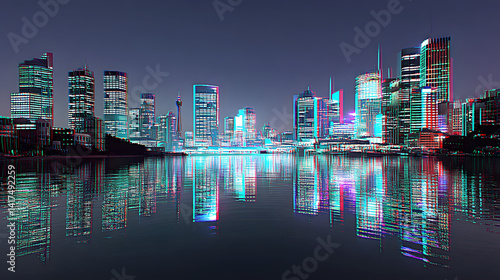 © Jan, Fototapeta premium City Skyline background with 3d glitch effect, retro 80s, 70s synthwave cityscape