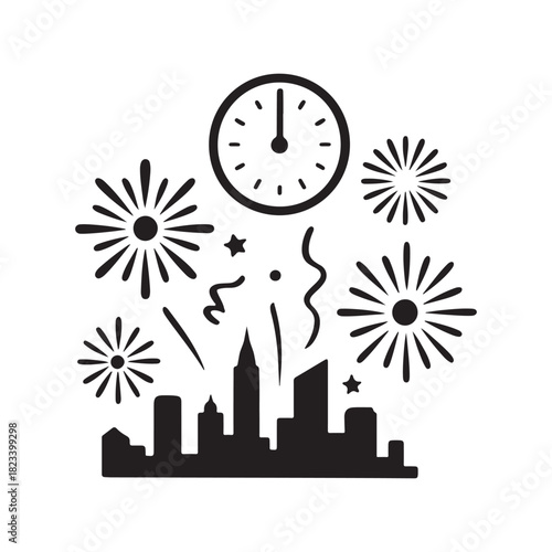 © Shahanaz, Fototapeta premium City skyline celebrates New Year's Eve with fireworks and a clock nearing midnight