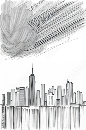 © Saim Art, Fototapeta premium City skyline coloring page and line art drawing showcasing modern architecture under a cloudy sky at dusk