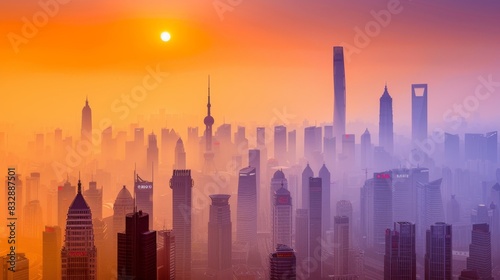 © Anzhela, Fototapeta premium City skyline covered by smog background, pollution and environmental concept, healthy risk, banner