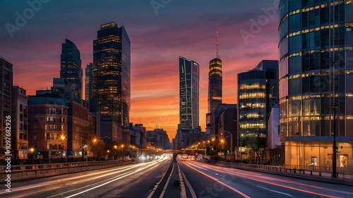 © Rony, Obraz premium City skyline displaying modern architecture and vibrant lights during sunset in an urban setting
