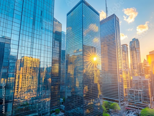 © Mahmuda, Obraz premium City Skyline Dominated by Tall Glass Skyscrapers Reflecting Sunrise, Modern Urban Architecture with Futuristic Aesthetic in a Serene Morning Glow