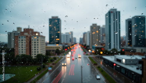 Obraz premium City skyline during rain with blurred traffic lights