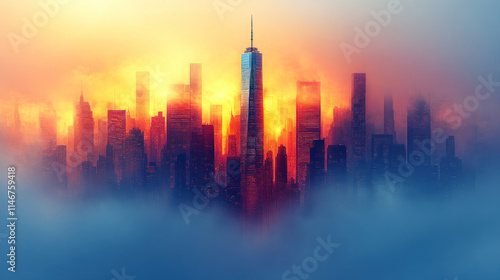 © Erisna Yolanda, Fototapeta premium City skyline engulfed in dramatic sunset fog.
