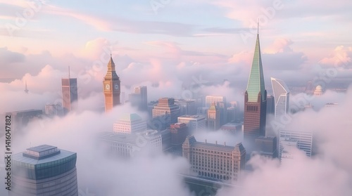 © Photique, Obraz premium City skyline enveloped in soft clouds at dawn.