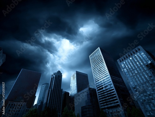 © VexoraImages, Fototapeta premium City skyline experiencing dark ominous storm clouds
