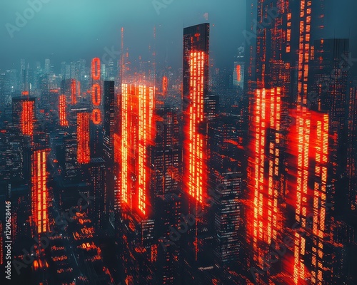 Fototapeta premium City skyline fading into digital red numbers, economic data crash metaphor,...