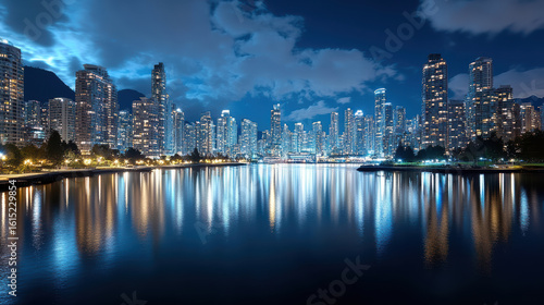 Fototapeta premium City skyline glowing deep blue hour sky, reflecting water surface, creating...