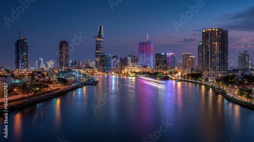© Tanu, Fototapeta premium City skyline illuminated at night along the river with colorful reflections in the water