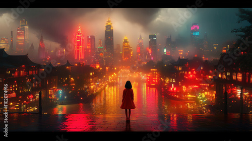 Fototapeta premium City skyline illuminated at night with vibrant lights and a lone figure...