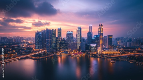 © jambulart, Fototapeta premium City skyline, illuminated buildings, sunset, water reflection.