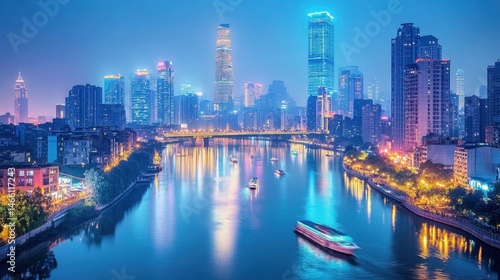 © Terablete, Fototapeta premium City skyline illuminated by colorful lights over a river at night in a vibrant urban setting