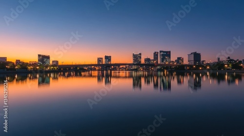 Fototapeta premium City skyline illuminated during the beautiful colorful sunset across the water