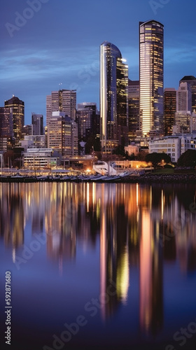 Naklejka premium city skyline in the evening with reflection in water