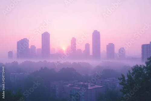 © Andrii Savchuk, Fototapeta premium City skyline in the soft pink light of sunrise