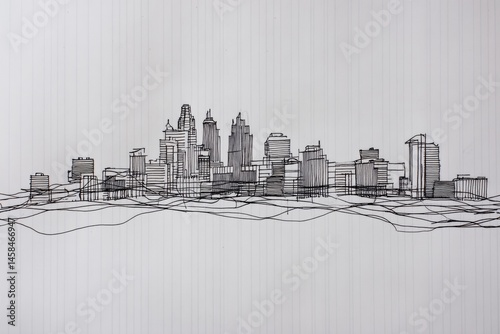 Fototapeta premium City Skyline Ink Drawing Features Flowing Continuous Line Art Representing...