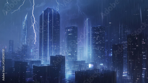 Obraz premium city skyline is illuminated by intense lightning during storm, with rain...